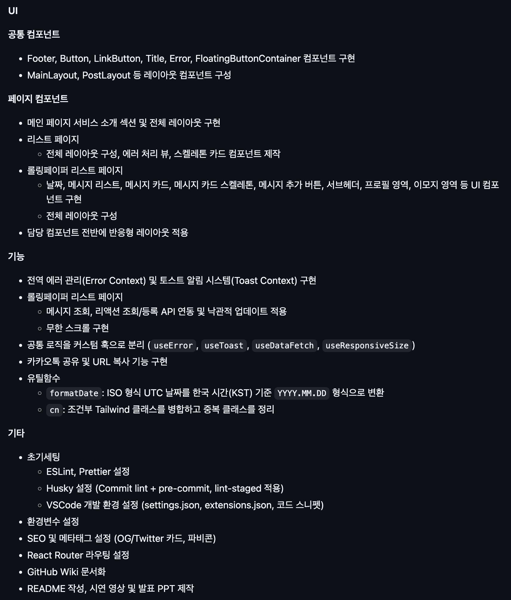 UI ๊ตฌํ, ์๋ฌ ์ฒ๋ฆฌ, ํ ์คํธ ์๋ฆผ, API ์ฐ๋๋ฑ์ ๋ด๋นํ์๋ค.