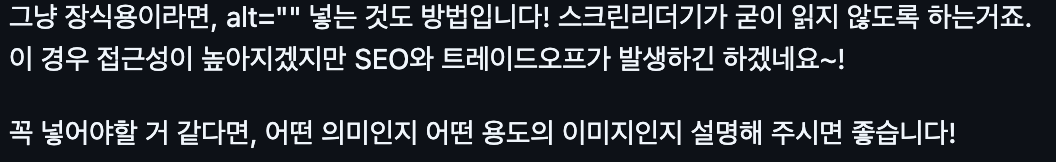 alt ์์ฑ ๊ฐ์ ๊ฒฝ์ฐ ์ฅ์์ฉ์ด๋ผ๋ฉด alt=""๋ก ๊ฐ์ ๋น์๋๋ ๋ฐฉ๋ฒ์ ์ฌ์ฉํ๋ค๊ณ ํ์ จ๊ณ ,