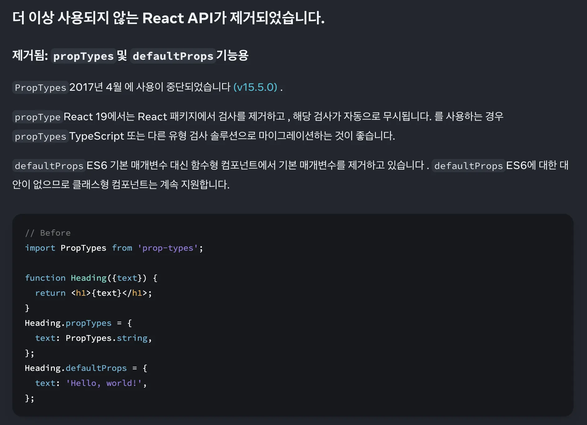 React 19์์๋ PropTypes๋ฅผ ๋ ์ด์ ์ฌ์ฉํ ์ ์๊ธฐ ๋๋ฌธ์